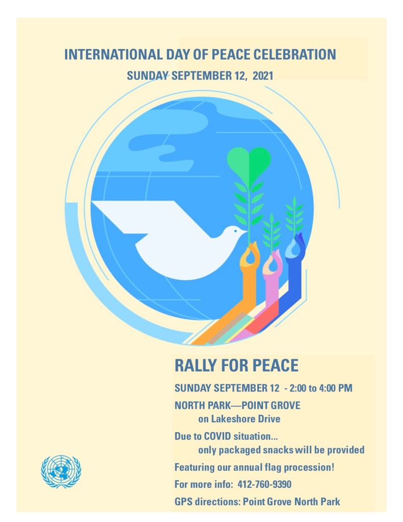 This Sunday, Sept 12, 2021, we are supporting the International Day of Peace Celebration Rally for Peace at North Park-Point Grove on Lakeshore Drive. Hope to see you all there!