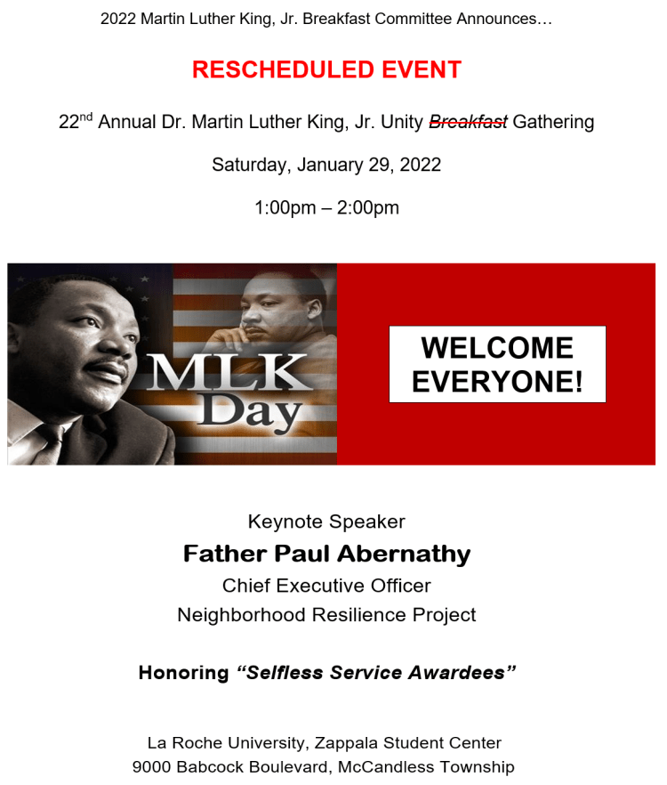 Thanks you for registering for the Dr. Martin Luther King, Jr. Unity Breakfast. Please see the rescheduled information below. Checks will be returned to all those who join us on January 29th. If you are unable to attend, please contact Jan at: peischl@comcast.net for a refund. Donations are always welcome. Hope to see you on the 29th.