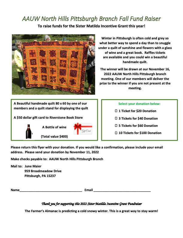 handmade quilt. The winner will be drawn at our November 16, 2022, AAUW North Hills Pittsburgh branch meeting. One of our members will deliver the prize to the winner if you are not present at the meeting.